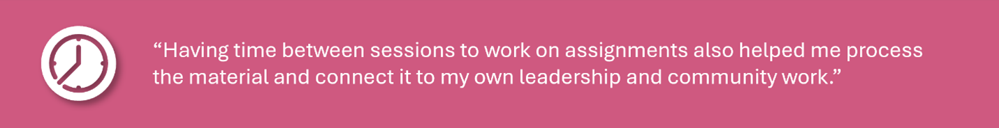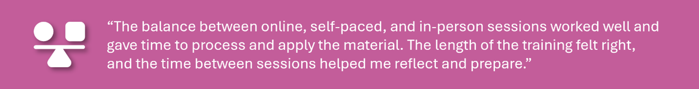 Mid-year 2025, all three PLDI training regions of Quebec, Ontario, and British Columbia delivered pilot sessions of the new Facilitation training. It was an innovative format of online and in-person to get the best of both worlds. Online training highlights geographical accessibility and at-home convenience while at the same time challenged participants to learn how to approach doing small group work in a virtual environment. Conversely, in-person training supports interpersonal connection and hands-on facilitation practice through face-to-face small group work.